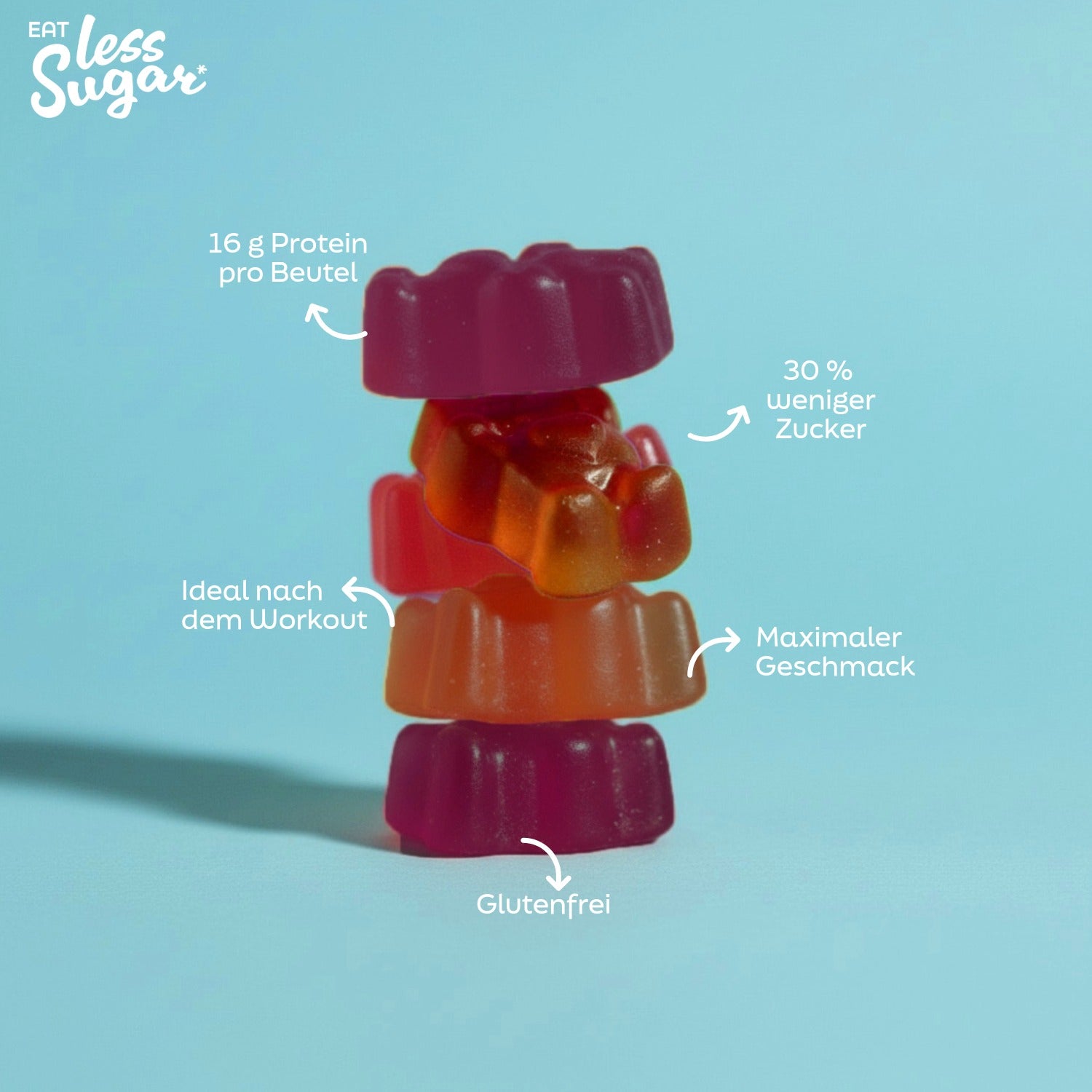 Glutenfrei und 30% Zuckerreduziert im Vergleich zu herkömmlichen Fruchtgummis – die perfekte Balance aus Funktion & Geschmack.